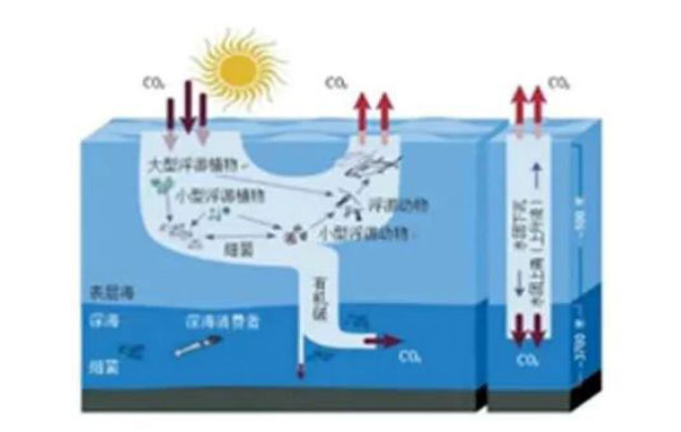 海洋對(duì)于減緩氣候變化具有舉足輕重的作用。海洋碳庫約是陸地碳庫的20倍,且海洋碳儲(chǔ)藏時(shí)間尺度比陸地生態(tài)系統(tǒng)長(zhǎng)的多。全球大洋吸收了工業(yè)革命以來人類排放CO2總量的1/3,目前每年從大氣吸收COz達(dá)20億噸,約占全球CO2排放量的1/4。海洋吸收CO2的主要機(jī)制包括“溶解度泵”、“碳酸鹽泵”、“生物泵”及“微型生物碳泵”。
