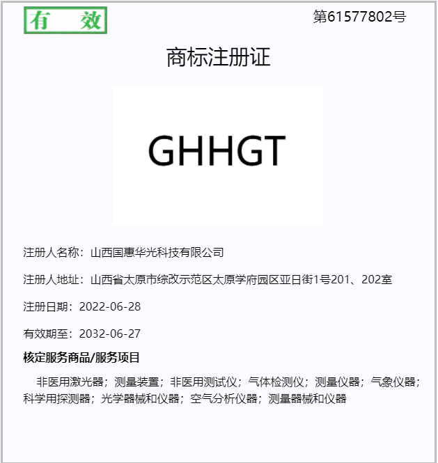 近日,國(guó)惠華光申請(qǐng)注冊(cè)的“GHHGT”商標(biāo),通過(guò)國(guó)家知識(shí)產(chǎn)權(quán)局審查受理,這標(biāo)志著公司在品牌建設(shè)方面又邁出了關(guān)鍵一步。近年來(lái),國(guó)惠華光圍繞企業(yè)定位和產(chǎn)業(yè)特色,聚焦工業(yè)級(jí)激光傳感技術(shù)創(chuàng)新,現(xiàn)已擁有激光氣體分析儀、機(jī)動(dòng)車尾氣遙感監(jiān)測(cè)系統(tǒng)、黑煙車電子抓拍系統(tǒng)、全激光束管監(jiān)測(cè)系統(tǒng)、溫室氣體監(jiān)測(cè)系統(tǒng)等系列產(chǎn)品,已完成從單一產(chǎn)品研發(fā)到行業(yè)解決方案供應(yīng)商的角色轉(zhuǎn)變,實(shí)現(xiàn)產(chǎn)品+服務(wù)多種盈利模式。國(guó)惠華光品牌知名度不斷提升。申請(qǐng)注冊(cè)“GHHGT”品牌商標(biāo),是公司保護(hù)重要無(wú)形資產(chǎn)的合法舉措,也有利于提高公司的企業(yè)品牌形象,促進(jìn)業(yè)務(wù)拓展,可為推動(dòng)公司發(fā)展奠定堅(jiān)實(shí)的基礎(chǔ)。